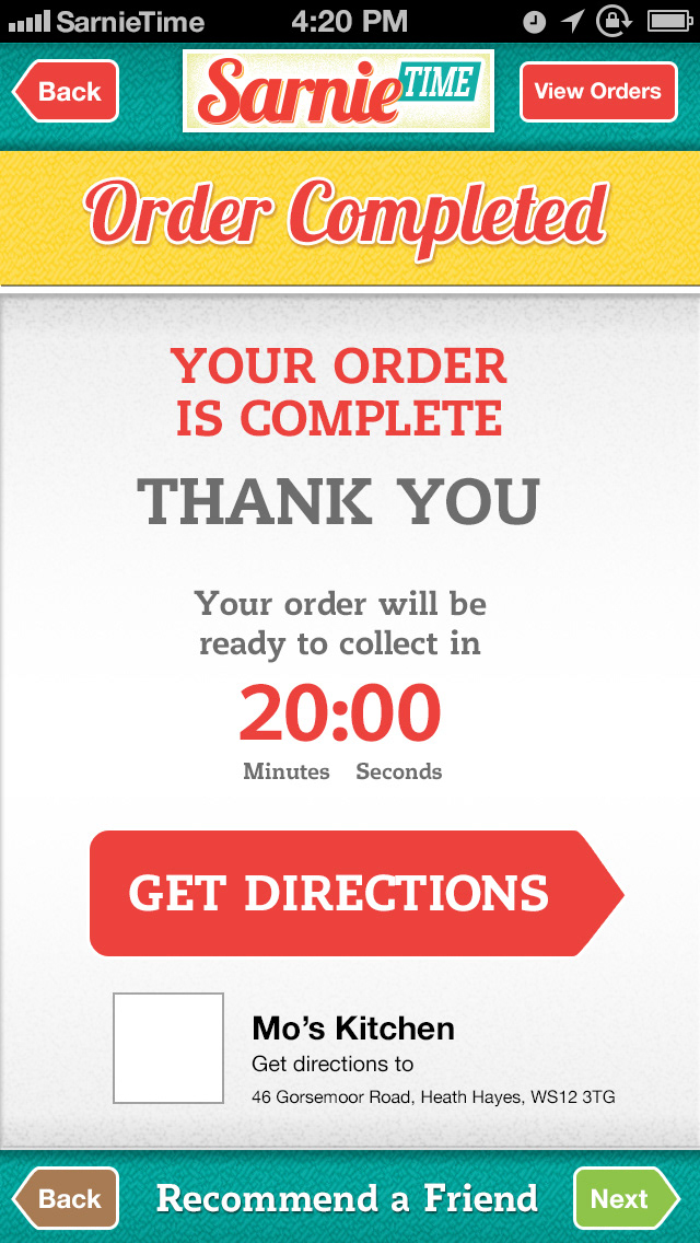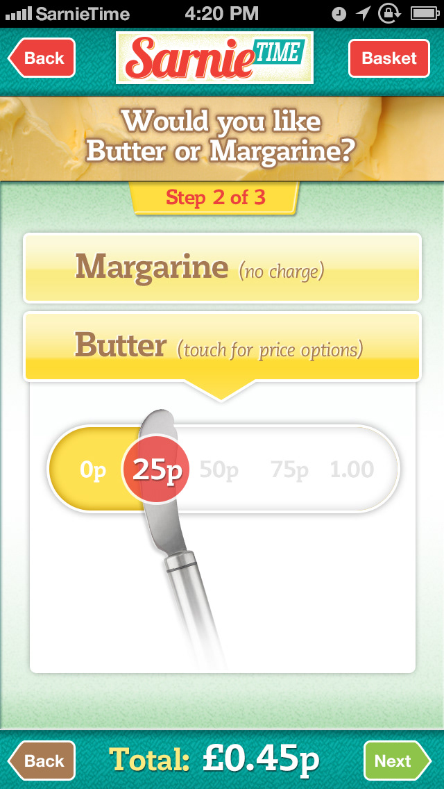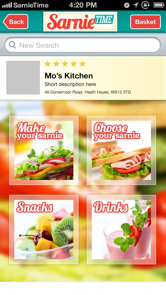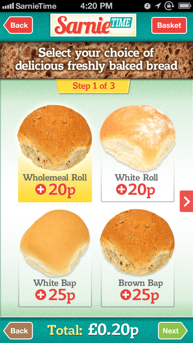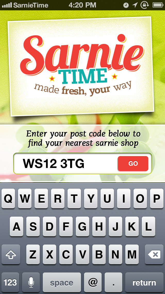 Brand design and development of an app interface called Sarnie Time. An app that allows users to locate sarnie shops in their current location and configure their sarnies.